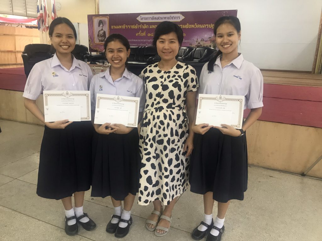 นางสาวณัฐพร ชูศรี ม.5/4, นางสาวมัณฑนา ชุมพลปกรณ์ ม.6/1 และนางสาวพรรณพัชร ตรัสรู้ ม.6/3 ได้รับเชิญจากสภาวัฒนธรรมจังหวัดนครปฐม ให้เข้าร่วมเสวนาทางวิชาการในหัวข้อ “แนวคิดและแนวทางการเสริมสร้างพลังทางวัฒนธรรมแก่สังคมไทยในยุคดิจิทัลจากบทพระราชนิพนธ์ในสมเด็จพระมหาธีรราชเจ้า” เนื่องในงานมหาธีรราชเจ้ารำลึก มหกรรมวัฒนธรรมจังหวัดนครปฐม ครั้งที่ 18 ประจำปี 2563 ผู้ฝึกซ้อม ครูสาวิตรี สุริยาวงษ์