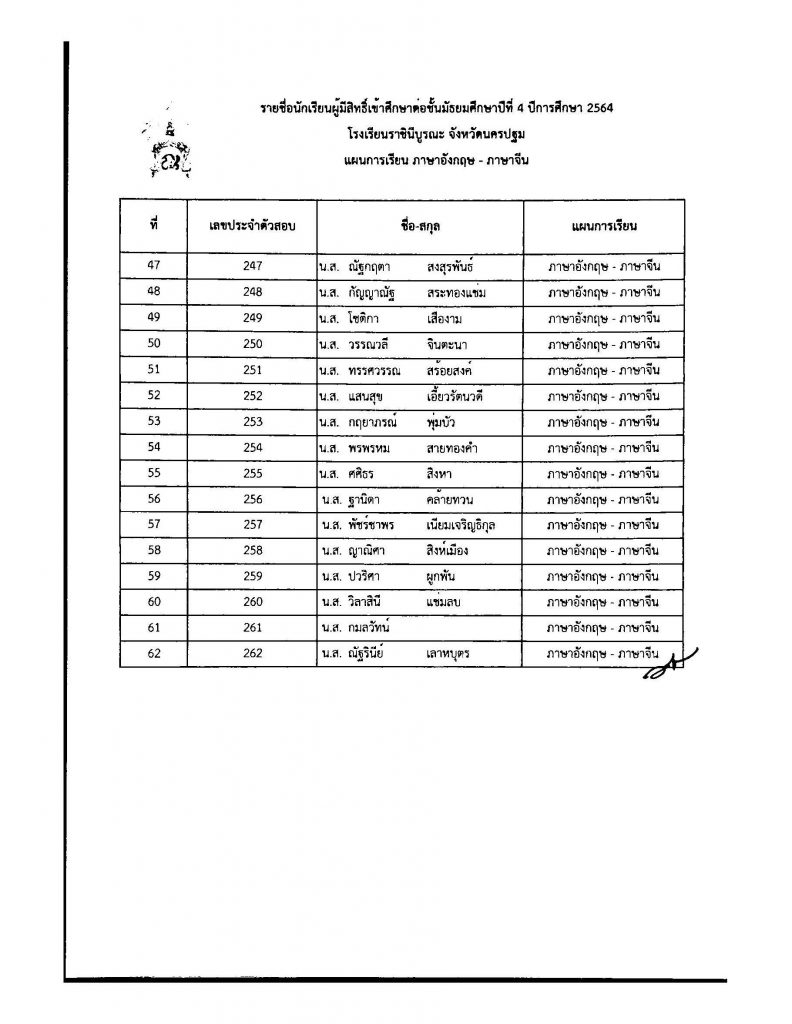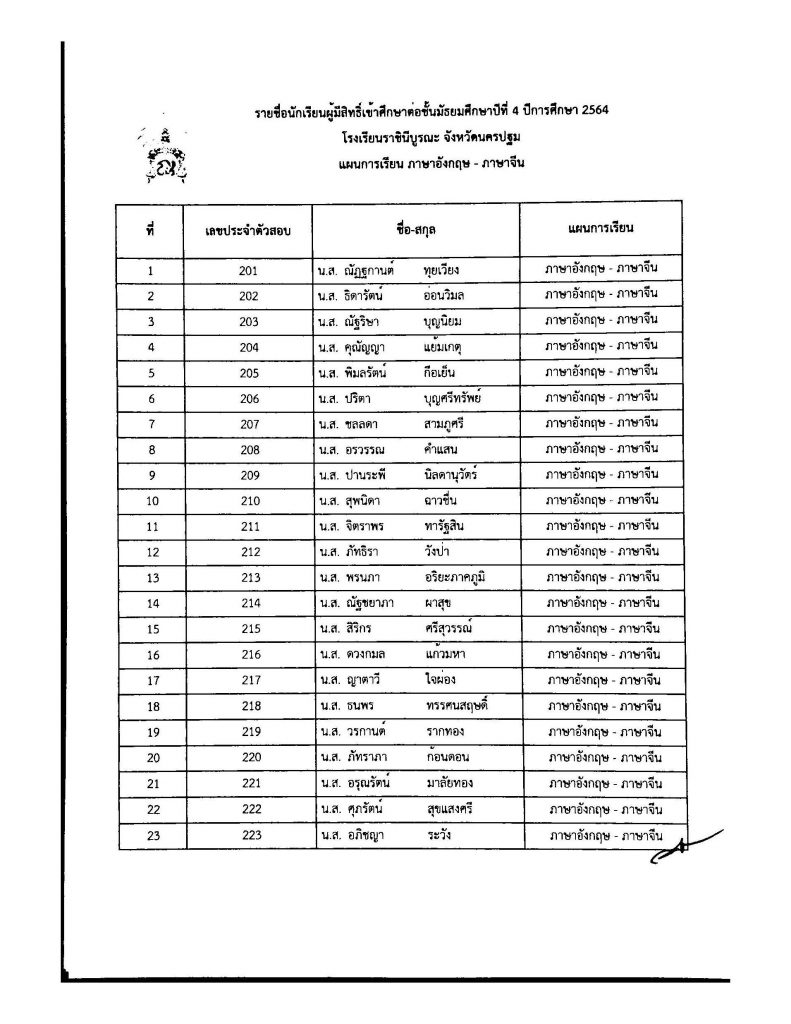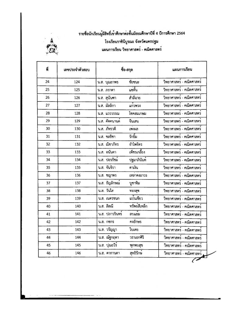 ประกาศรายชื่อผู้มีสิทธิ์เข้าศึกษาต่อ ระดับชั้น ม.4 ประเภทห้องเรียนปกติ ปีการศึกษา 2564
