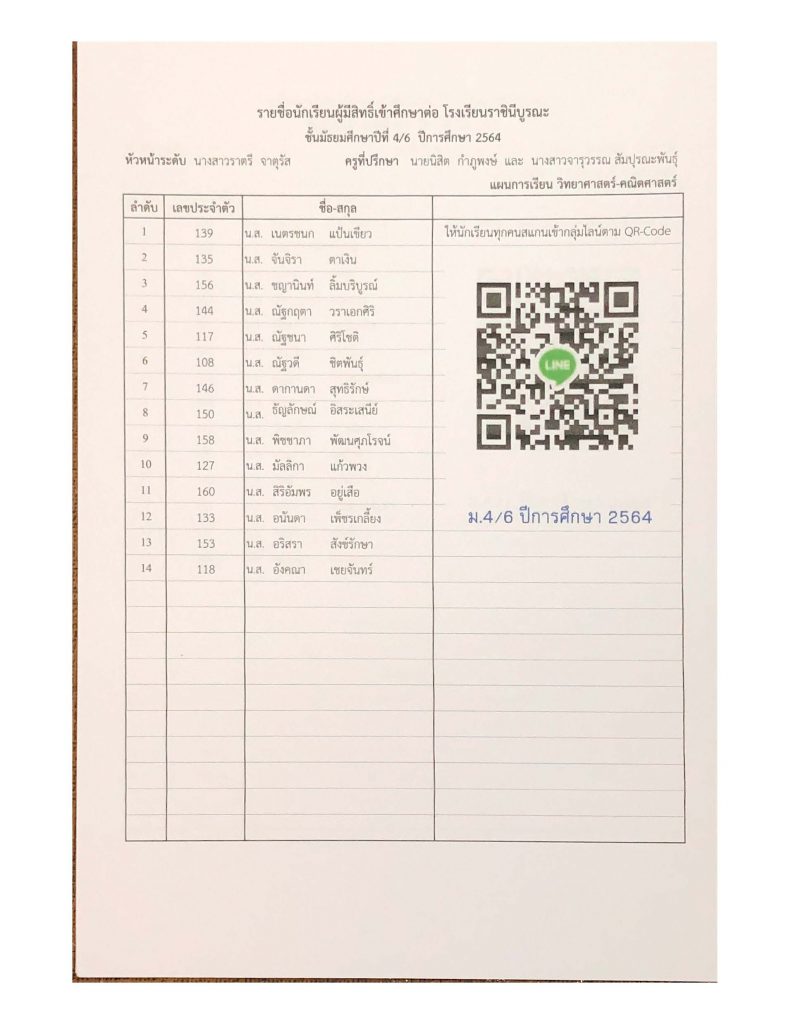 ประกาศรายชื่อผู้มีสิทธิ์เข้าศึกษาต่อ ระดับชั้น ม.4 ประเภทห้องเรียนปกติ ปีการศึกษา 2564 แยกตามห้อง