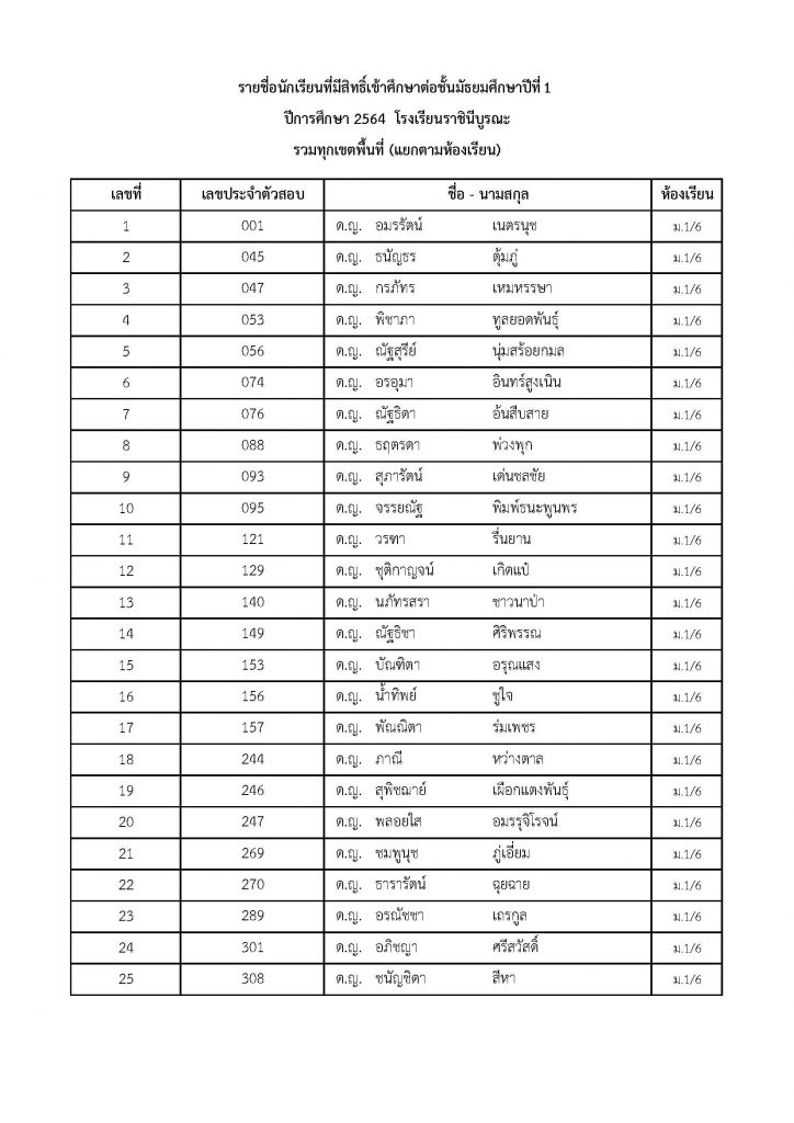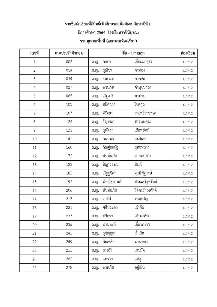 รายชื่อนักเรียนที่มีสิทธิ์เข้าศึกษาต่อชั้นมัธยมศึกษาปีที่ 1 ปีการศึกษา 2564 โรงเรียนราชินีบูรณะ รวมทุกเขตพื้นที่ (แยกตามห้องเรียน)