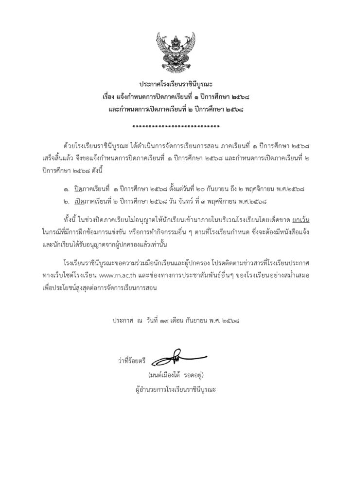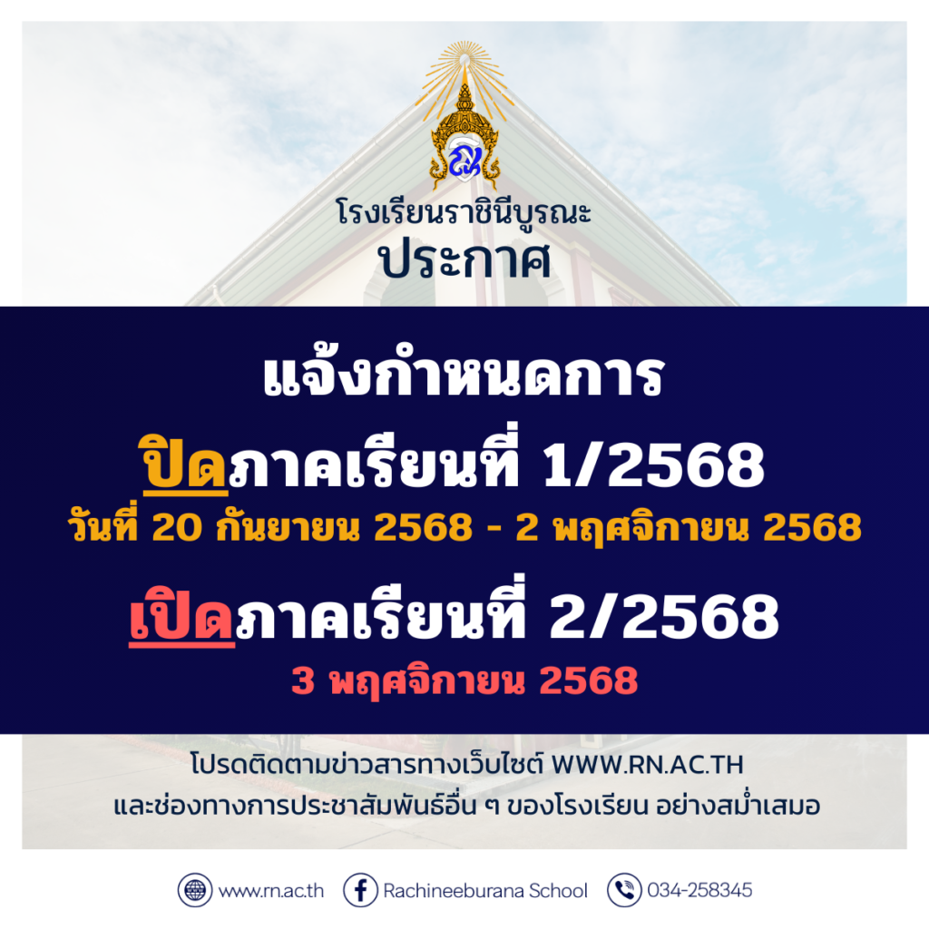 ประกาศแจ้งกำหนดการ ปิดภาคเรียนที่ 1/2568 – เปิดภาคเรียนที่ 2/2568
