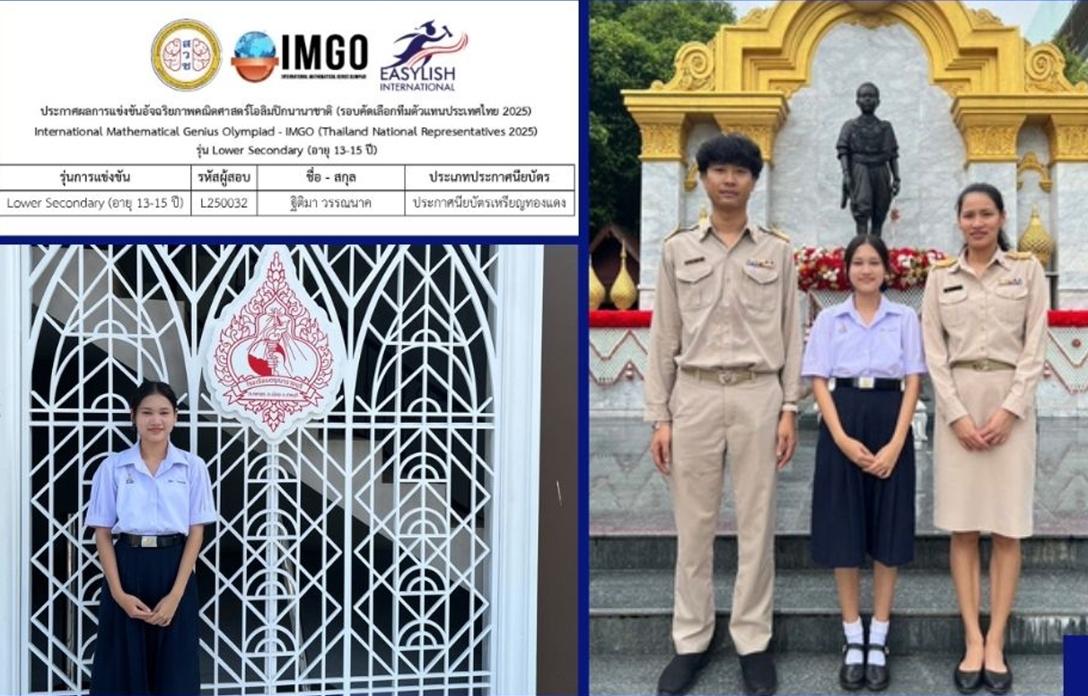 ขอแสดงความยินดีกับนางสาวฐิติมา วรรณนาค ชั้นมัธยมศึกษาปีที่ 4/1 รางวัลประกาศนียบัตรเหรียญทองแดง รุ่น Lower Secondary ระดับอายุ 13 – 15 ปี การแข่งขันอัจฉริยภาพคณิตศาสตร์โอลิมปิกนานาชาติ (รอบคัดเลือกทีมตัวแทนประเทศไทย 2025) International Mathematical Genius Olympiad – IMGO (Thailand National Representatives 2025) จัดโดยมูลนิธิโครงการสอบวัดทักษะวิชาการ และโอลิมปิกนานาชาติ (มูลนิธิ สวช. และโอลิมปิกนานาชาติ) ฝึกซ้อมโดย นายวัชรพันธ์ ทองจันทา และนางสาวรุ่งนภา มีใจ