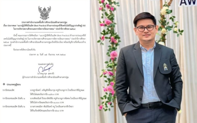 ขอแสดงความยินดีกับ นายฐานันตร์ เจริญศักดิ์ธนากุล ครูชํานาญการ กลุ่มสาระการเรียนรู้วิทยาศาสตร์และเทคโนโลยี ได้รับรางวัลชนะเลิศ พร้อมโล่รางวัล และเงินรางวัล 1,500 บาท การประกวดผลงาน “แนวปฏิบัติที่เป็นเลิศ (Best Practice) ด้านการประยุกต์ใช้เทคโนโลยีปัญญาประดิษฐ์ (AI) ในการบริหารสถานศึกษาและการจัดการเรียนการสอน” ประจําปีการศึกษา 2568 จัดโดย สํานักงานเขตพื้นที่การศึกษามัธยมศึกษานครปฐม
