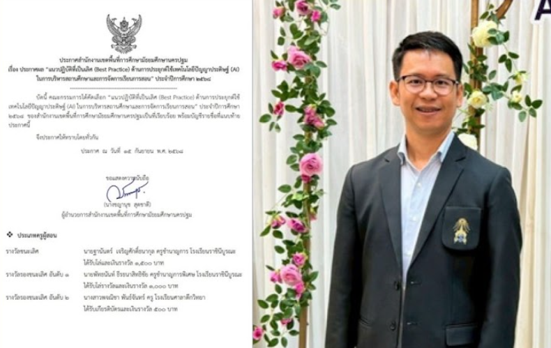 ขอแสดงยินดีกับ นายพัทธนันท์ ธีรธนาสิทธิชัย ครูชํานาญการพิเศษ กลุ่มสาระการเรียนรู้ภาษาต่างประเทศ ได้รับรางวัลรองชนะเลิศ อันดับ 1 พร้อมโล่รางวัล และเงินรางวัล 1,000 บาท การประกวดผลงาน “แนวปฏิบัติที่เป็นเลิศ (Best Practice) ด้านการประยุกต์ใช้เทคโนโลยีปัญญาประดิษฐ์ (AI) ในการบริหารสถานศึกษาและการจัดการเรียนการสอน” ประจําปีการศึกษา 2568 จัดโดย สํานักงานเขตพื้นที่การศึกษามัธยมศึกษานครปฐม