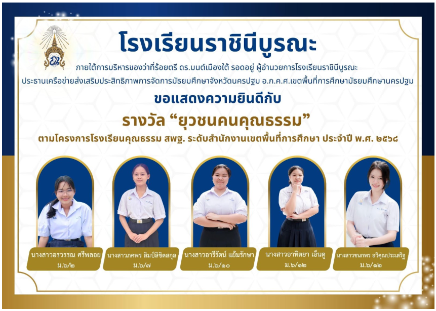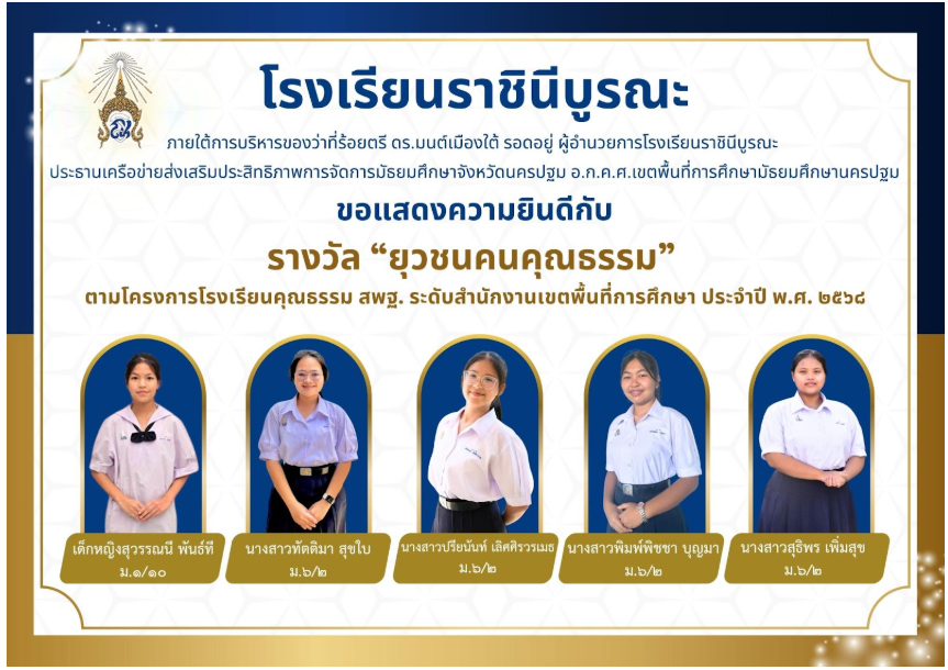 ขอแสดงความยินดีกับนักเรียนที่ได้รับรางวัล “ยุวชนคนคุณธรรม” ตามโครงการโรงเรียนคุณธรรม สพฐ. ระดับสํานักงานเขตพื้นที่การศึกษา ประจําปี พ.ศ. 2568