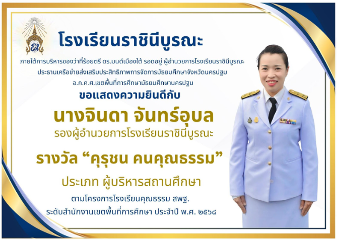 ขอแสดงความยินดีกับนางจินดา จันทร์อุบล รองผู้อํานวยการโรงเรียนราชินีบูรณะ ได้รับรางวัล “คุรุชน คนคุณธรรม” ประเภท ผู้บริหารสถานศึกษา ตามโครงการโรงเรียนคุณธรรม สพฐ. ระดับสํานักงานเขตพื้นที่การศึกษา ประจําปี พ.ศ. 2568