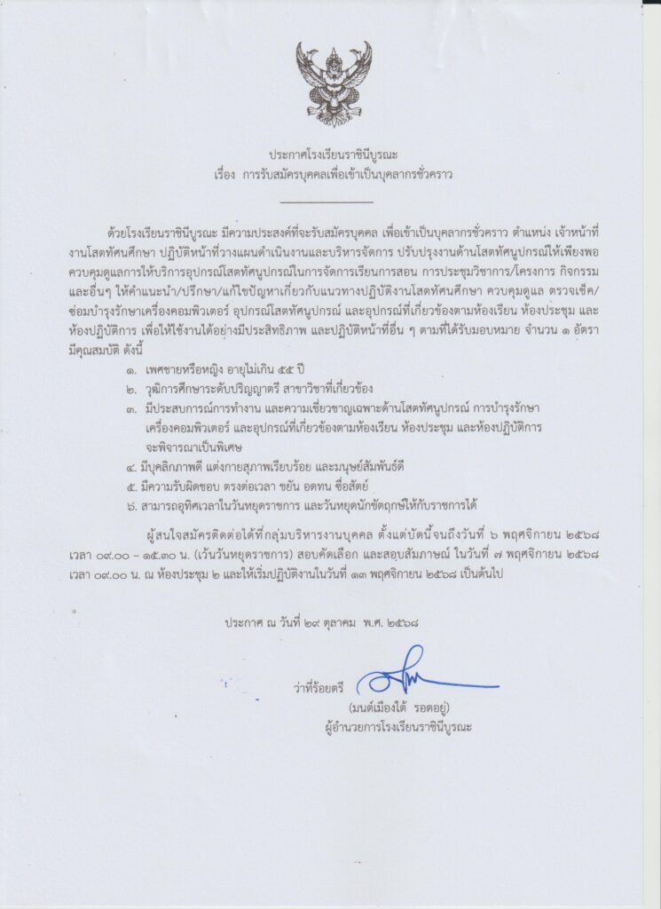 ประกาศ รับสมัครบุคคลเพื่อเข้าเป็นบุคลากรชั่วคราว ตำแหน่ง เจ้าหน้าที่งานโสตทัศนศึกษา