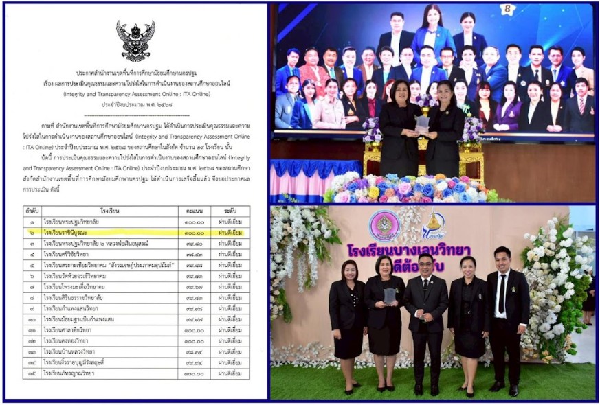 โรงเรียนราชินีบูรณะ ได้รับโล่รางวัล ระดับดีเยี่ยม จาก ดร.ชญานุช สุดชาดี ผอ.สพม.นครปฐม ในการประเมินคุณธรรมและความโปร่งใส ในการดําเนินงานของสถานศึกษาออนไลน์ (Integrity and Transparency Assessment : ITA) ประจําปีงบประมาณ พ.ศ. 2568 ของสํานักงานเขตพื้นที่การศึกษา มัธยมศึกษานครปฐม ด้วยคะแนนเต็ม 100 คะแนน