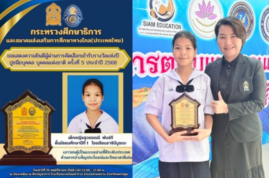 ขอแสดงความยินดีกับเด็กหญิงสุวรรณนี พันธ์ที ชั้นมัธยมศึกษาปีที่ 1/10 ได้รับโล่รางวัลยกย่องเชิดชูเกียรติ “รางวัลแห่งปีปูชนียบุคคลแห่งชาติ” สาขาเยาวชนผู้เป็นแบบอย่างที่ดี ระดับประเทศ ด้านจิตอาสาและบําเพ็ญประโยชน์ดีเด่น ประจําพุทธศักราช 2568 จัดโดยกระทรวงศึกษาธิการและสมาคมส่งเสริมการศึกษาทางไกล (ประเทศไทย)