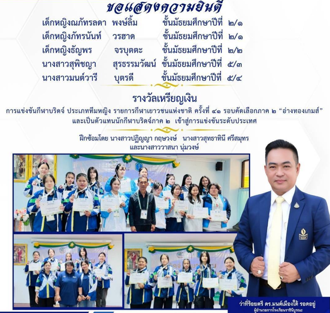 ขอแสดงความยินดีกับเด็กหญิงณภัทรลดา พงษ์ลิ้ม ชั้นมัธยมศึกษาปีที่ 2/1 เด็กหญิงภัทรนันท์ วรฮาด ชั้นมัธยมศึกษาปีที่ 2/1 เด็กหญิงธัญพร จรบุตตะ ชั้นมัธยมศึกษาปีที่ 2/2 นางสาวสุพิชญา สุรธรรมวัฒน์ ชั้นมัธยมศึกษาปีที่ 5/3 นางสาวมนต์วารี บุตรดี ชั้นมัธยมศึกษาปีที่ 5/4 ได้รับรางวัลเหรียญเงิน การแข่งขันกีฬาบริดจ์ ประเภททีมหญิง รายการกีฬาเยาวชนแห่งชาติ ครั้งที่ 41 รอบคัดเลือกภาค 2 “อ่างทองเกมส์” และเป็นตัวแทนนักกีฬาบริดจ์ภาค 2 เข้าสู่การแข่งขันระดับประเทศ ฝึกซ้อมโดย นางสาวปฏิญญา กฤษวงษ์ นางสาวสุทธาทินี ศรีสมุทร และนางสาววาสนา นุ่มวงษ์