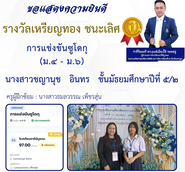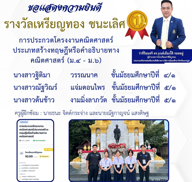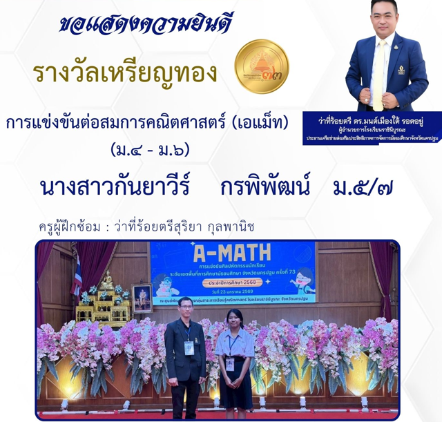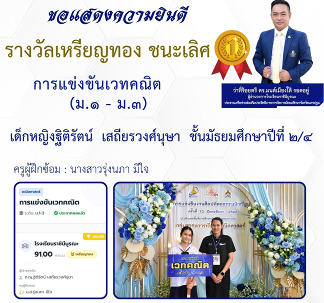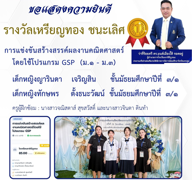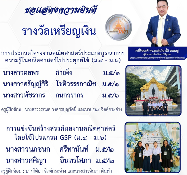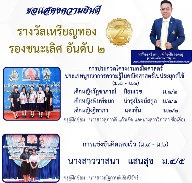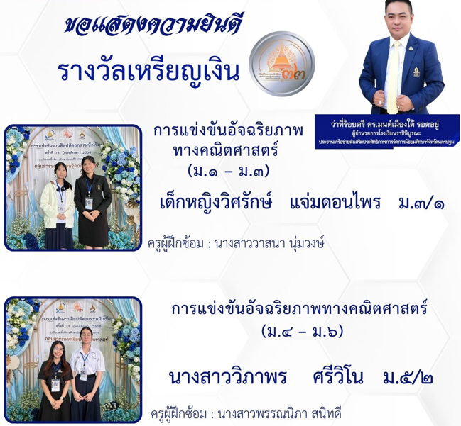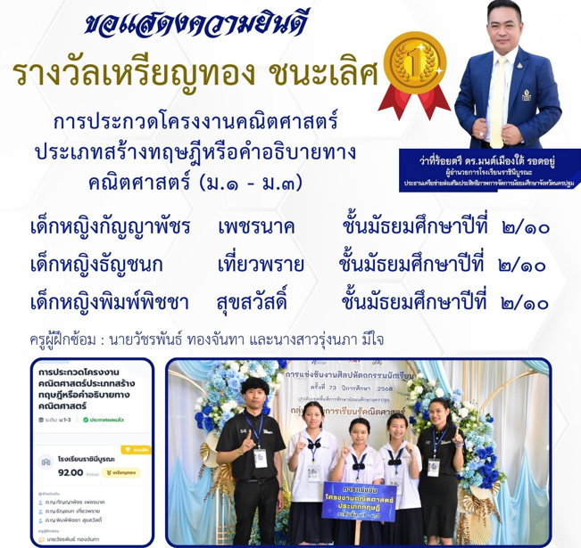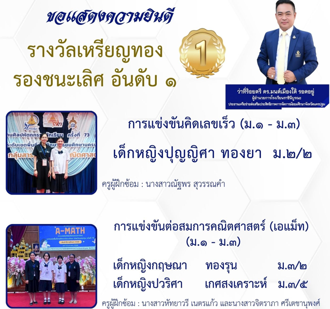 ขอแสดงความยินดีกับนักเรียนที่ได้รับรางวัลจากการแข่งขันงานศิลปหัตถกรรมนักเรียน ระดับเขตพื้นที่การศึกษา ครั้งที่ 73 ปีการศึกษา 2568 กลุ่มสาระการเรียนรู้คณิตศาสตร์