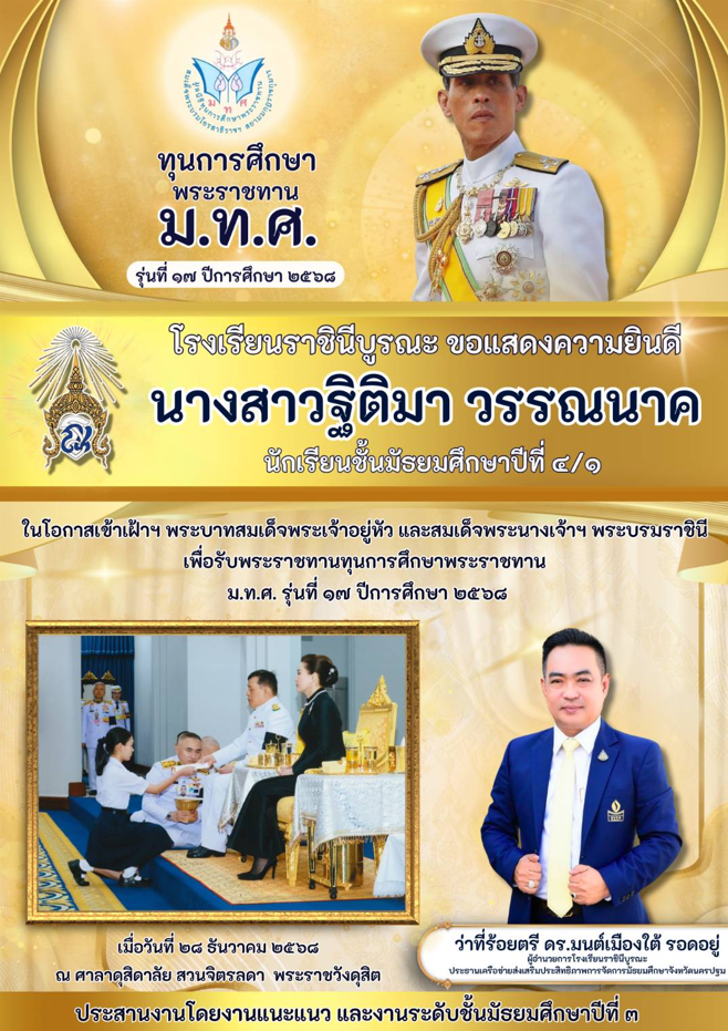 ขอแสดงความยินดีกับนางสาวฐิติมา วรรณนาค นักเรียนชั้นมัธยมศึกษาปีที่ 4/1 ในโอกาสเข้าเฝ้าฯ พระบาทสมเด็จพระเจ้าอยู่หัว และสมเด็จพระนางเจ้าฯ พระบรมราชินี เพื่อรับพระราชทานทุนการศึกษาพระราชทาน ม.ท.ศ. รุ่นที่ 17 ปีการศึกษา 2568 เมื่อวันที่ 28 ธันวาคม 2568 ณ ศาลาดุสิดาลัย สวนจิตรลดา พระราชวังดุสิต
