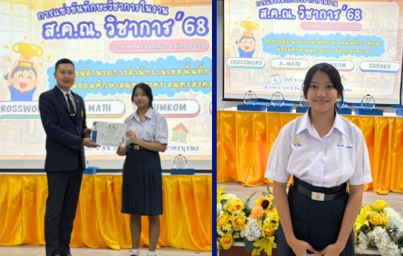 ขอแสดงความยินดีกับนางสาวกันยาวีร์ กรพิพัฒน์ ชั้นมัธยมศึกษาปีที่ 5/7 ได้รับรางวัลรองชนะเลิศอันดับ 1 การแข่งขัน A-Math ระดับชั้น ม.4 – ม.6 การแข่งขันทักษะวิชาการ งานนิทรรศการวิชาการ “ส.ค.ณ. วิชาการ 68 (S.K.N. Academic Fairs 2025) ณ โรงเรียนสมุทรสาครบูรณะ จังหวัดสมุทรสาคร ฝึกซ้อมโดย นางสาวหัทยาวรี เนตรแก้ว