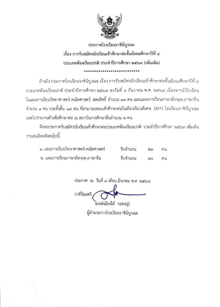 ประกาศ เรื่อง การรับสมัครนักเรียน เข้าศึกษาต่อระดับชั้นมัธยมศึกษาปีที่ 4 ประเภทห้องเรียนปกติ ประจำปีการศึกษา 2569 (เพิ่มเติม)