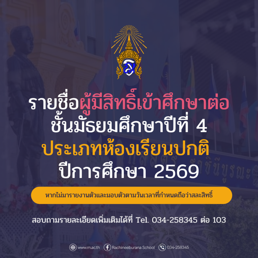 คลิกที่นี่ : รายชื่อผู้มีสิทธิ์เข้าศึกษาต่อชั้นมัธยมศึกษาปีที่ 4 ประเภทห้องเรียนปกติ ปีการศึกษา 2569 (ตัวจริง)