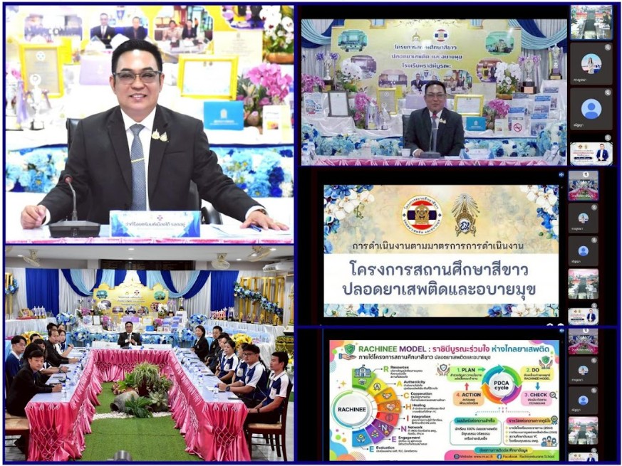 ว่าที่ร้อยตรี ดร.มนต์เมืองใต้ รอดอยู่ ผู้อํานวยการโรงเรียนราชินีบูรณะ พร้อมด้วยคณะผู้บริหาร และคณะครู รับการประเมินโครงการ สถานศึกษาสีขาวปลอดยาเสพติด และอบายมุข ระดับรักษามาตรฐานระดับเพชรปีที่ 3 ปีการศึกษา 2568 ของโรงเรียนราชินีบูรณะ รูปแบบออนไลน์ ผ่าน Google Meet ณ หอประชุม 2