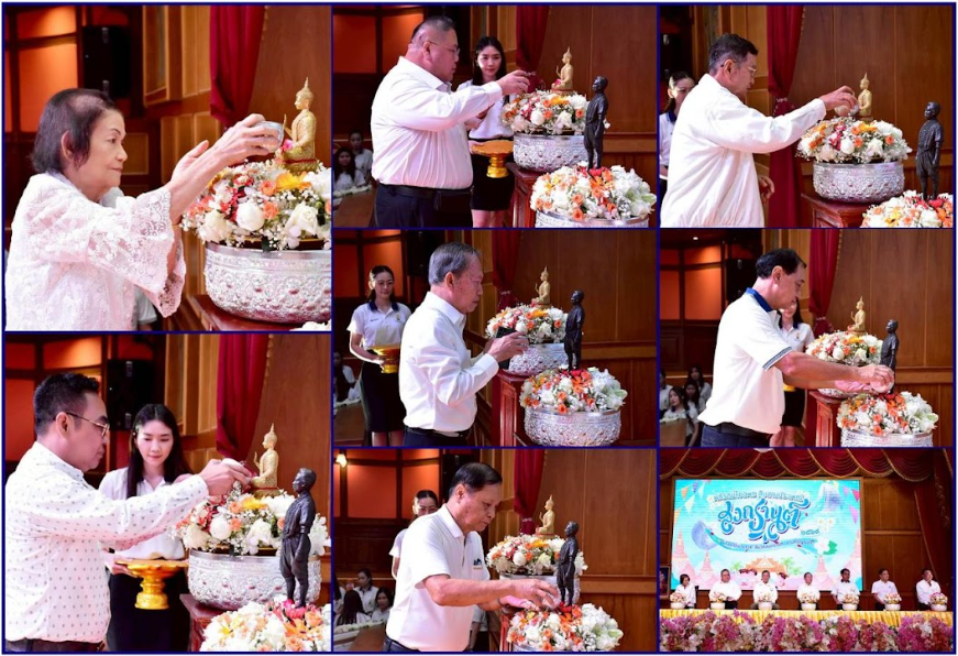 คณะผู้บริหาร คณะครู และบุคลากรของโรงเรียนราชินีบูรณะ ร่วมพิธีรดน้ำขอพร ผอ.สิริยุพา ศกุนตะเสฐียร ผอ.ประดิษฐ์ รัตนคเชนทร์ ผอ.อนันต์ เอกเผ่าพันธุ์ ผอ.สุริยา ชิณณะพงศ์ รองผอ.ฉลวย ชาวนาวิก นายกองโทเอกพันธุ์ คุปตวัช ประธาน กรรมการสถานศึกษาขั้นพื้นฐานโรงเรียนราชินีบูรณะ และว่าที่ร้อยตรี ดร.มนต์เมืองใต้ รอดอยู่ ผู้อํานวยการโรงเรียนราชินีบูรณะ เพื่อสืบสานประเพณีสงกรานต์ ประจําปี 2569 “ร้อยรักราชาวดี สืบวิถีสงกรานต์ สานกตัญญุตา” ณ หอประชุม 100 ปี ราชินีบูรณะ (เทพผดุงพร)
